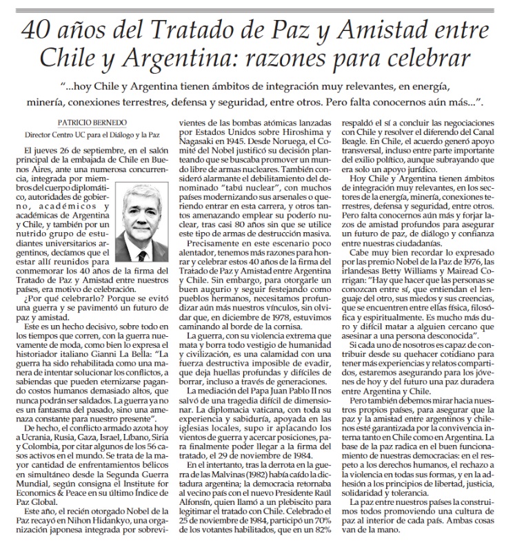 Se publicó en El Mercurio, “A 40 años de la firma del Tratado de Paz y Amistad Chile y Argentina: razones para celebrar”, sábado 2 de noviembre de 2024, página A2.